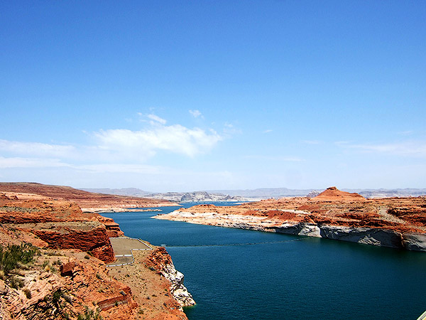 Lake Powell — это результат перекрытия р. Колорадо плотиной. Против её строительства выступали природоохранные организации. Они до сих пор не смирились с плотиной и призывают слить воду из каньона. Тем не менее результат получился очень красивым. Ярко синяя вода озера на фоне бело-красных холмов побережья. Озеро очень большое, второе по величине после озер Мид, созданного плотиной Гувера. Береговая линия озера почти 2000 миль, что по некоторым оценкам больше, чем береговая линия атлантического побережья США.